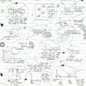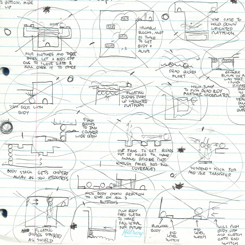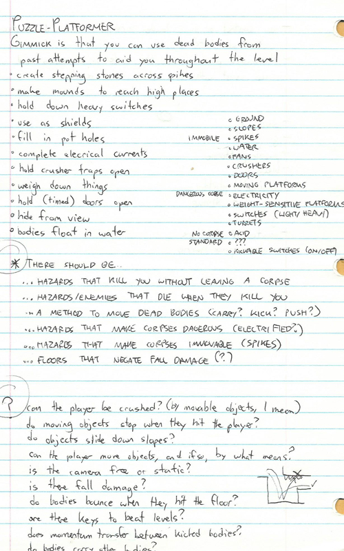 So with that in mind the next step is to do a lot of thinking. In what way could corpses be used to solve puzzles? How would you move them around? Can the corpses push each other? How many ways can you die to create a corpse? Could some methods of dying render a corpse unmovable, or dangerous, or completely destroyed? Et cetera, et cetera — I like to get as clear an image as possible of how the game will behave before I start doing any “real” work.