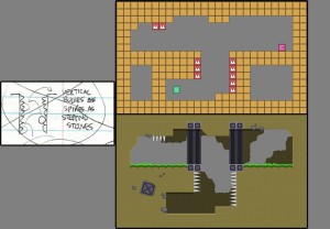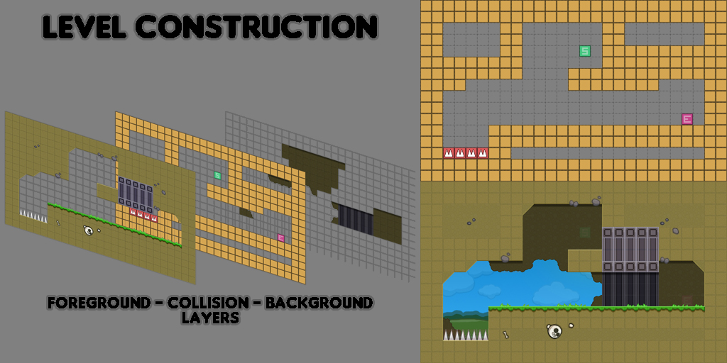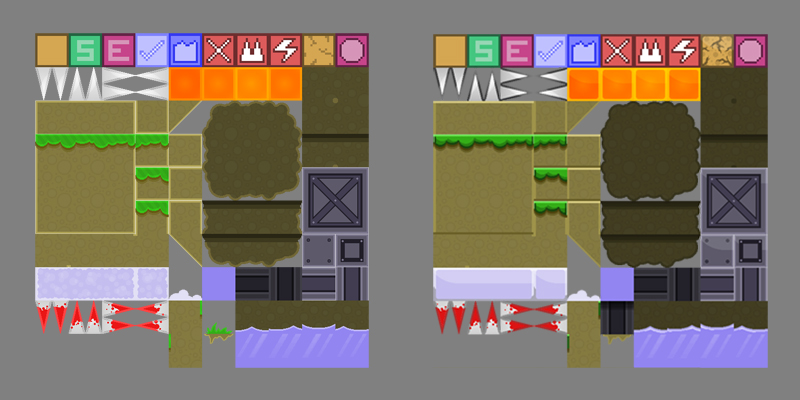When I was done creating and testing all the levels, I got to make a tileset and spruce them up, to make them look something like an actual game. I’ve discussed tilesets a bit before, so here’s a quick visual breakdown of a level’s construction.