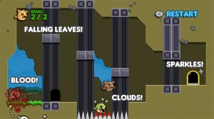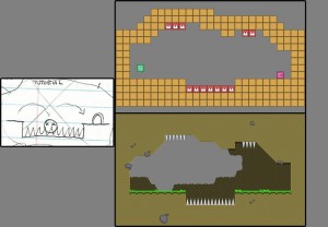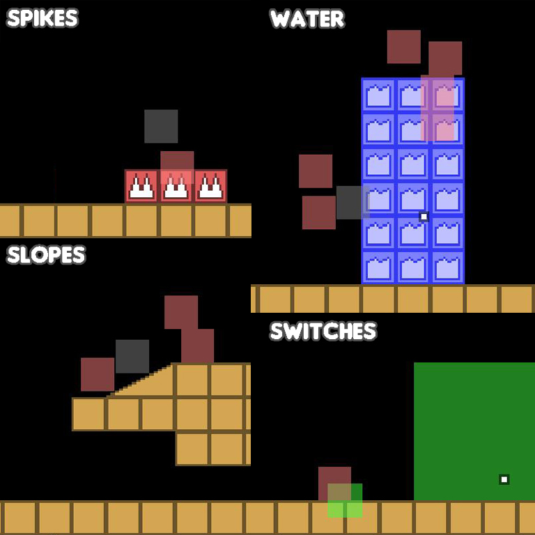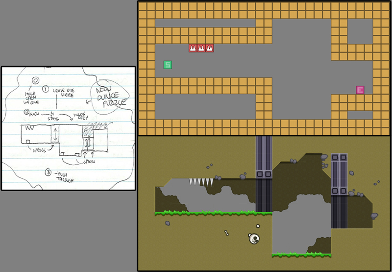 I ended up with forty-to-fifty levels which was plenty, so I got to work roughing it out! Over the years I’ve developed a basic engine that I can now use to quickly try out game ideas, letting me see if they’re fun and making sure I can code them properly. Using that basic engine, I started creating and testing the core of the game — first the player, then the corpses, then the various obstacles I’d planned like spikes, water, buttons, moving platforms, etc. It doesn’t look pretty at this stage but it’s not supposed to — it’s all about making the game work and making it fun.
