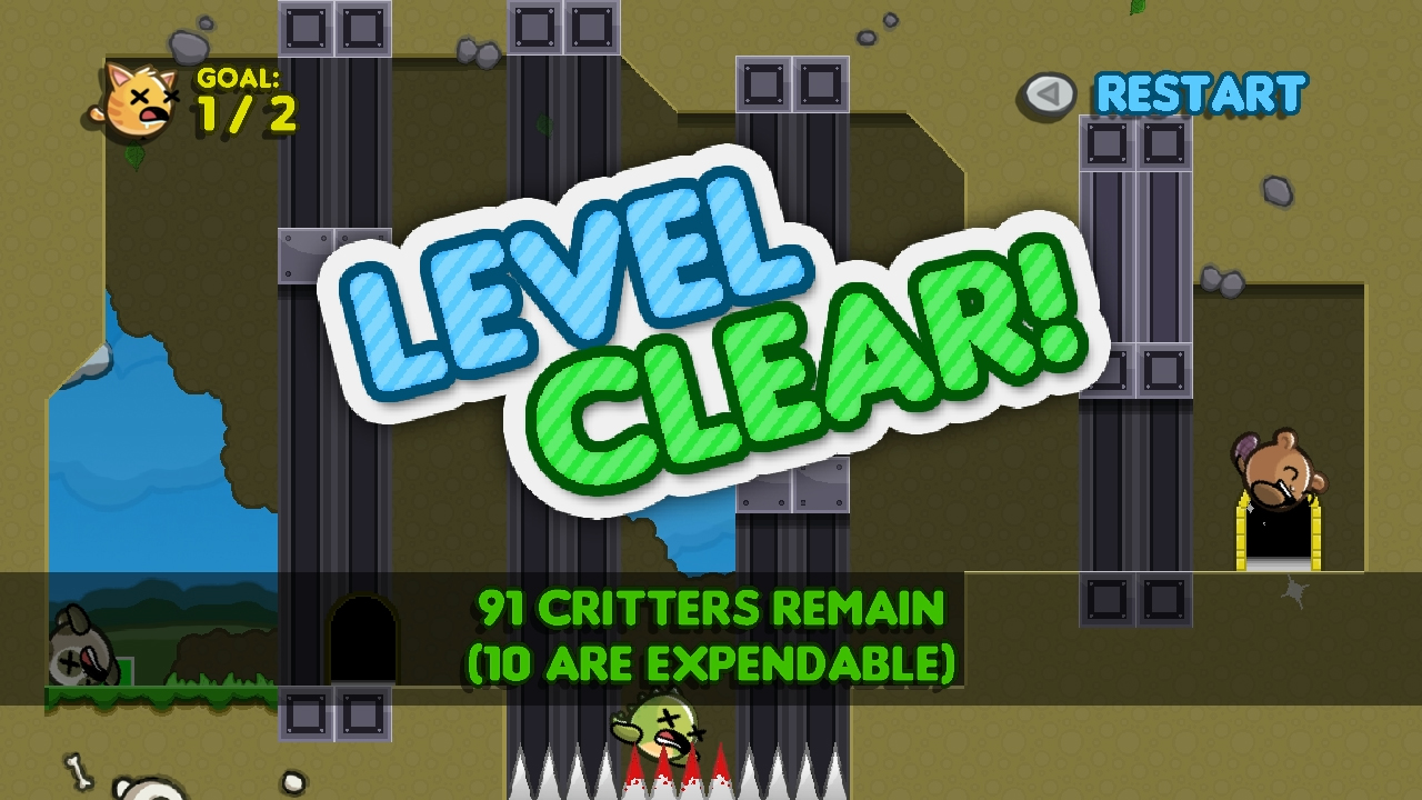 Designing the HUD also raised some interesting questions. I wanted you to start with 100 animals at the beginning of the game and slowly lose them as you went, but I wanted some of the animals to be expendable so that you could experiment a bit and fudge some puzzles where you might get stuck. Each level was designed with a specific number of necessary deaths in mind. So at any one time, the player might want to know: how many animals do I have left? How many of those animals are expendable? How many am I supposed to kill to beat this level? I like keeping things as simple as possible, so after some brainstorming with my immensely good sport and brainstorming friend Brian, I decided on something like this, which I believe is a good balance between simple and informative. You can always tell the target deaths and how many times you’ve died for each level. When you beat a level, the other stats come up.