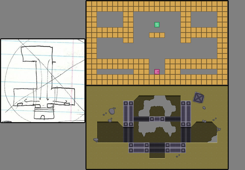 So at this point you could say the building blocks of the game were coplete, and it was time to use them to create the game itself. Again in super-rough form, I went through my puzzle ideas and turned them into actual levels (using the free program, Tiled!)