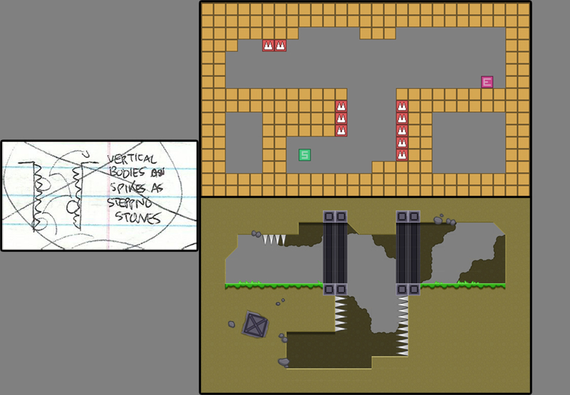 Happy accidents also occur at many stages of development! When I was testing out spikes, it just so happened that when you jumped into them from below, the corpse would hang in the air for a second before falling — almost as if it was stuck on the spikes and then sliding off. I didn’t design it that way or even consider the idea — the way I coded it just happened to produce that result, which I really enjoyed and kept, and even used in a few puzzles.