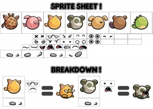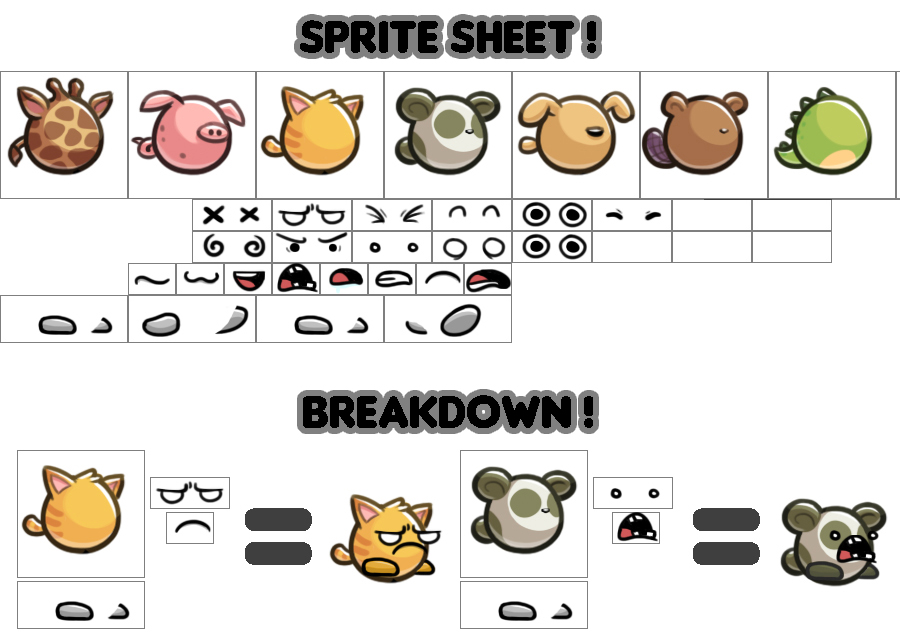 Then I got to design the silly animals that the player controls. I wanted it to feel like you were constantly presented with new and different animals, so I separated their features into a sprite sheet (which I’ve also discussed previously!) In short, it allows the various bodies and features to be mixed-and-matched to create many different animals!